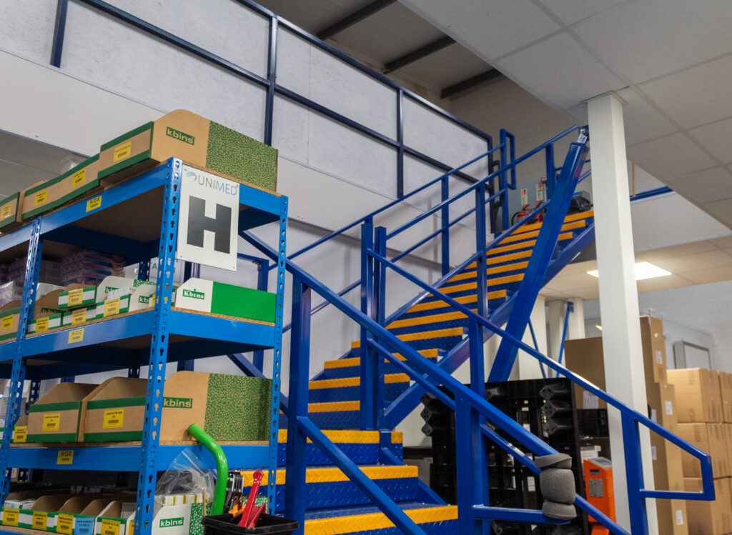We recently completed a full mezzanine installation for Unimed at their site in Romsey. The project involved designing and building a brand-new mezzanine floor, complete with bespoke stair access and a fully integrated goods lift.